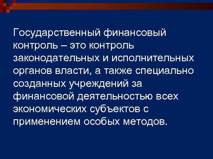 Государственный финансовый контроль – это контроль законодательных и исполнительных органов власти, а также специально созданных учреждений за финансовой деятельностью всех экономических субъектов с применением особых методов.