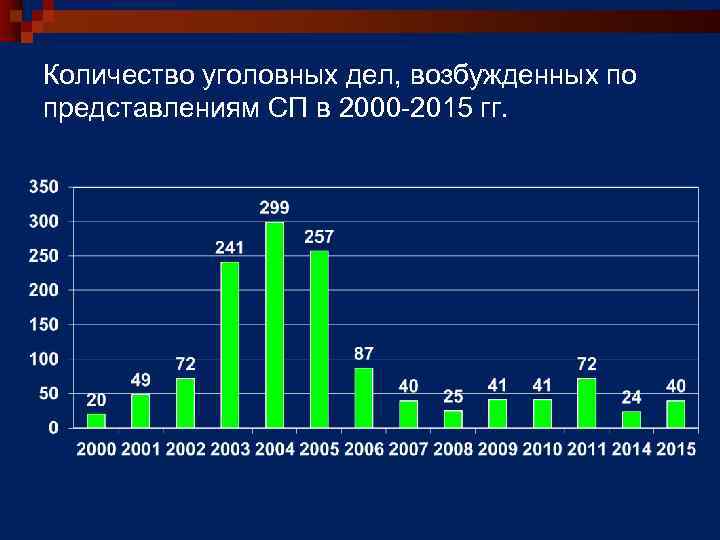 Количество уголовных дел, возбужденных по представлениям СП в 2000 -2015 гг.
