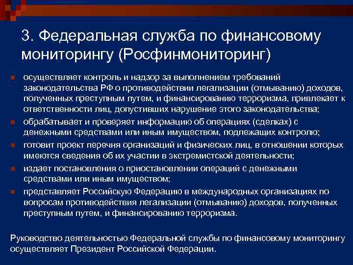 3. Федеральная служба по финансовому мониторингу (Росфинмониторинг) n n n осуществляет контроль и надзор за выполнением требований законодательства РФ о противодействии легализации (отмыванию) доходов, полученных преступным путем, и финансированию терроризма, привлекает к ответственности лиц, допустивших нарушение этого законодательства; обрабатывает и проверяет информацию об операциях (сделках) с денежными средствами или иным имуществом, подлежащих контролю; готовит проект перечня организаций и физических лиц, в отношении которых имеются сведения об их участии в экстремистской деятельности; издает постановления о приостановлении операций с денежными средствами или иным имуществом; представляет Российскую Федерацию в международных организациях по вопросам противодействия легализации (отмыванию) доходов, полученных преступным путем, и финансированию терроризма. Руководство деятельностью Федеральной службы по финансовому мониторингу осуществляет Президент Российской Федерации.