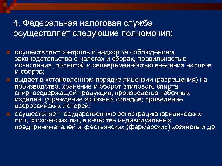 4. Федеральная налоговая служба осуществляет следующие полномочия: n n n осуществляет контроль и надзор за соблюдением законодательства о налогах и сборах, правильностью исчисления, полнотой и своевременностью внесения налогов и сборов; выдает в установленном порядке лицензии (разрешения) на производство, хранение и оборот этилового спирта, спиртосодержащей продукции, производство табачных изделий; учреждение акцизных складов; проведение всероссийских лотерей; осуществляет государственную регистрацию юридических лиц, физических лиц в качестве индивидуальных предпринимателей и крестьянских (фермерских) хозяйств и др.