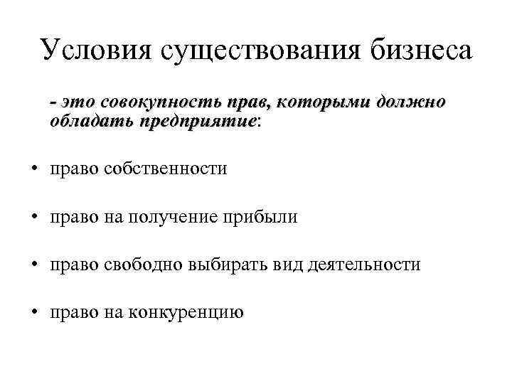 Условия существования бизнеса - это совокупность прав, которыми должно обладать предприятие: предприятие • право собственности • право на получение прибыли • право свободно выбирать вид деятельности • право на конкуренцию