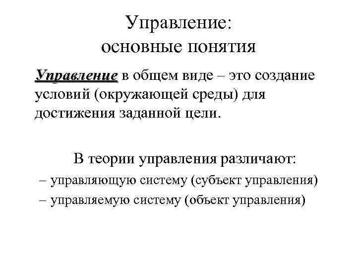 Управление: основные понятия Управление в общем виде – это создание условий (окружающей среды) для достижения заданной цели. В теории управления различают: – управляющую систему (субъект управления) – управляемую систему (объект управления)