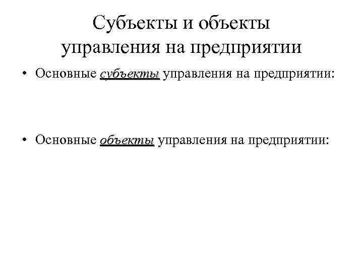Субъекты и объекты управления на предприятии • Основные субъекты управления на предприятии: • Основные объекты управления на предприятии: