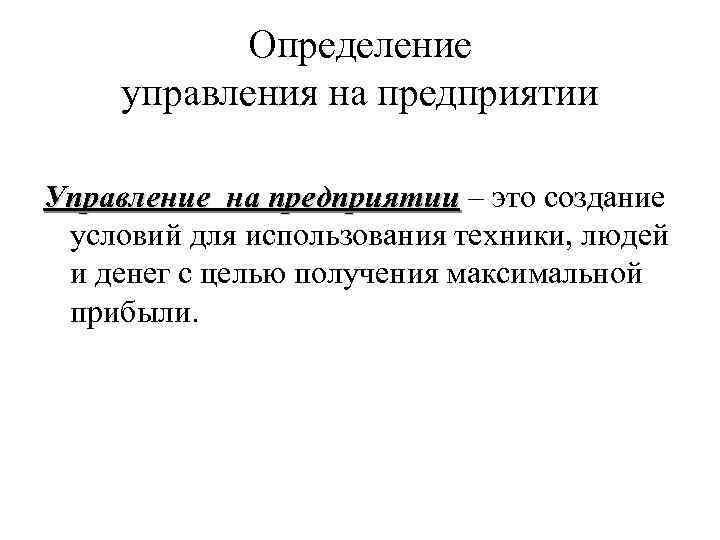 Определение управления на предприятии Управление на предприятии – это создание условий для использования техники, людей и денег с целью получения максимальной прибыли.