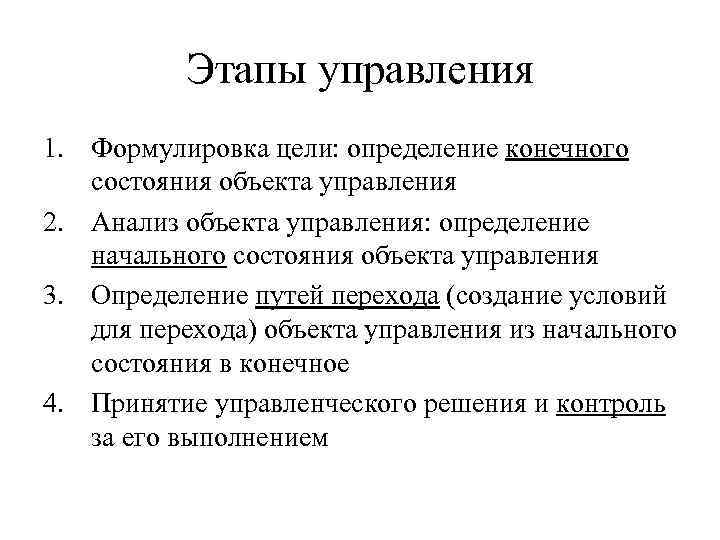 Этапы управления 1. Формулировка цели: определение конечного состояния объекта управления 2. Анализ объекта управления: определение начального состояния объекта управления 3. Определение путей перехода (создание условий для перехода) объекта управления из начального состояния в конечное 4. Принятие управленческого решения и контроль за его выполнением