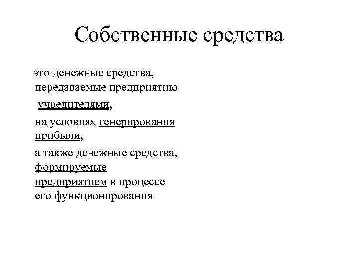 Собственные средства это денежные средства, передаваемые предприятию учредителями, на условиях генерирования прибыли, а также денежные средства, формируемые предприятием в процессе его функционирования