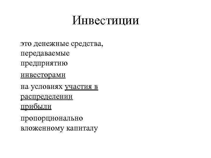 Инвестиции это денежные средства, передаваемые предприятию инвесторами на условиях участия в распределении прибыли пропорционально вложенному капиталу