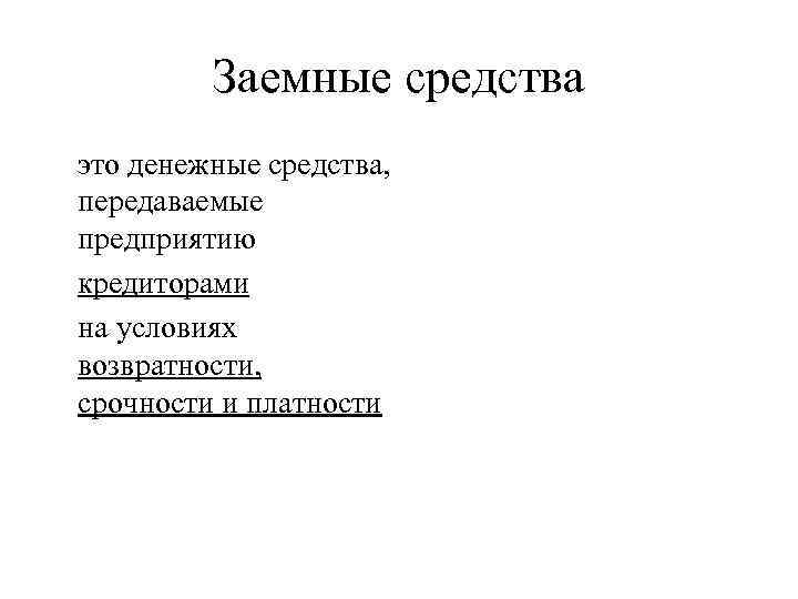 Заемные средства это денежные средства, передаваемые предприятию кредиторами на условиях возвратности, срочности и платности