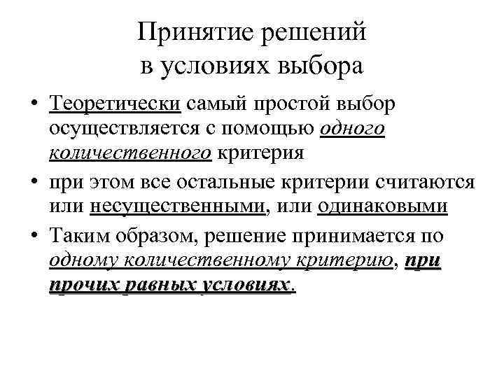 Принятие решений в условиях выбора • Теоретически самый простой выбор осуществляется с помощью одного количественного критерия • при этом все остальные критерии считаются или несущественными, или одинаковыми • Таким образом, решение принимается по одному количественному критерию, при прочих равных условиях