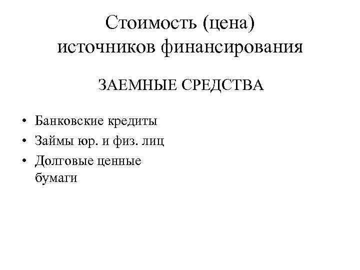Стоимость (цена) источников финансирования ЗАЕМНЫЕ СРЕДСТВА • Банковские кредиты • Займы юр. и физ. лиц • Долговые ценные бумаги