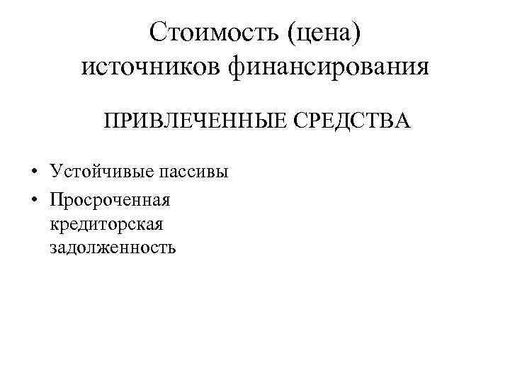 Стоимость (цена) источников финансирования ПРИВЛЕЧЕННЫЕ СРЕДСТВА • Устойчивые пассивы • Просроченная кредиторская задолженность