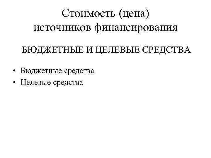 Стоимость (цена) источников финансирования БЮДЖЕТНЫЕ И ЦЕЛЕВЫЕ СРЕДСТВА • Бюджетные средства • Целевые средства