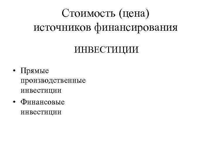 Стоимость (цена) источников финансирования ИНВЕСТИЦИИ • Прямые производственные инвестиции • Финансовые инвестиции