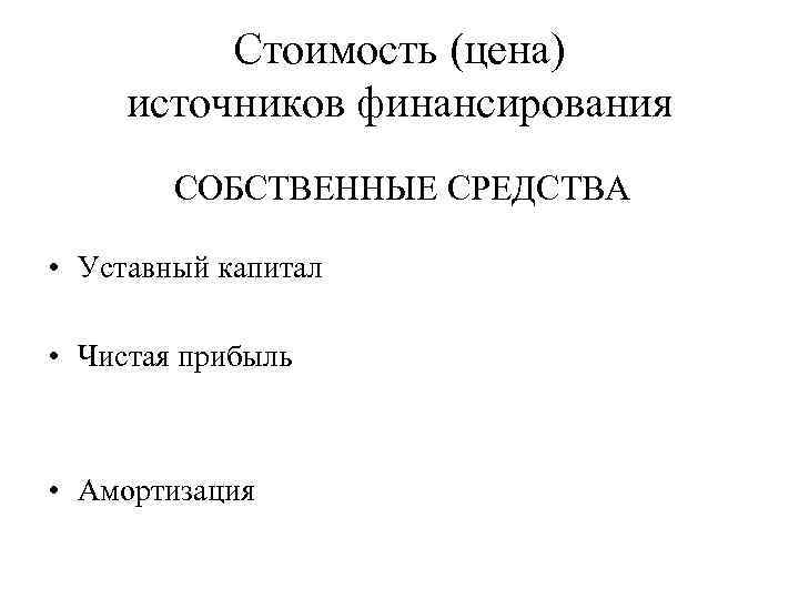 Стоимость (цена) источников финансирования СОБСТВЕННЫЕ СРЕДСТВА • Уставный капитал • Чистая прибыль • Амортизация
