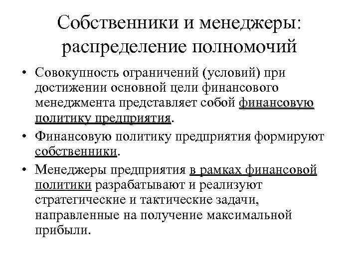 Собственники и менеджеры: распределение полномочий • Совокупность ограничений (условий) при достижении основной цели финансового менеджмента представляет собой финансовую политику предприятия • Финансовую политику предприятия формируют собственники. • Менеджеры предприятия в рамках финансовой политики разрабатывают и реализуют стратегические и тактические задачи, направленные на получение максимальной прибыли.