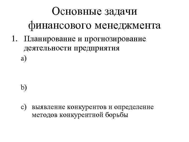 Основные задачи финансового менеджмента 1. Планирование и прогнозирование деятельности предприятия a) b) c) выявление конкурентов и определение методов конкурентной борьбы