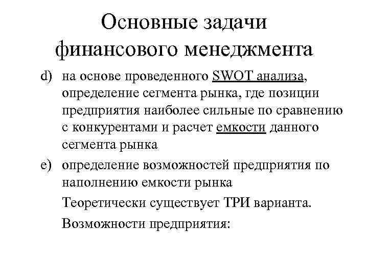 Основные задачи финансового менеджмента d) на основе проведенного SWOT анализа, определение сегмента рынка, где позиции предприятия наиболее сильные по сравнению с конкурентами и расчет емкости данного сегмента рынка e) определение возможностей предприятия по наполнению емкости рынка Теоретически существует ТРИ варианта. Возможности предприятия: