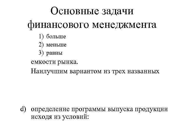 Основные задачи финансового менеджмента 1) больше 2) меньше 3) равны емкости рынка. Наилучшим вариантом из трех названных d) определение программы выпуска продукции исходя из условий: