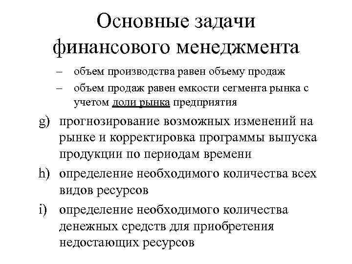 Основные задачи финансового менеджмента – объем производства равен объему продаж – объем продаж равен емкости сегмента рынка с учетом доли рынка предприятия g) прогнозирование возможных изменений на рынке и корректировка программы выпуска продукции по периодам времени h) определение необходимого количества всех видов ресурсов i) определение необходимого количества денежных средств для приобретения недостающих ресурсов
