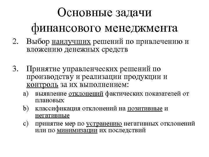 Основные задачи финансового менеджмента 2. Выбор наилучших решений по привлечению и вложению денежных средств 3. Принятие управленческих решений по производству и реализации продукции и контроль за их выполнением: a) выявление отклонений фактических показателей от плановых b) классификация отклонений на позитивные и негативные c) принятие мер по устранению негативных отклонений или по минимизации их последствий