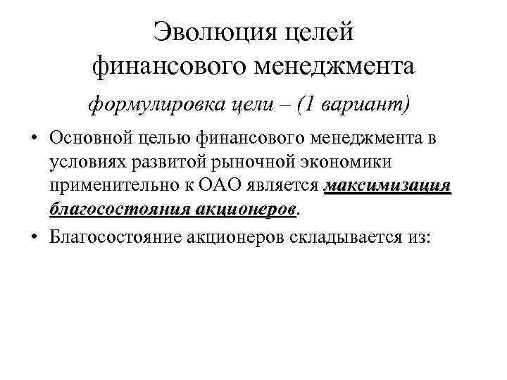 Эволюция целей финансового менеджмента формулировка цели – (1 вариант) • Основной целью финансового менеджмента в условиях развитой рыночной экономики применительно к ОАО является максимизация благосостояния акционеров • Благосостояние акционеров складывается из: