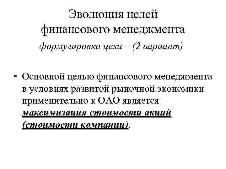 Эволюция целей финансового менеджмента формулировка цели – (2 вариант) • Основной целью финансового менеджмента в условиях развитой рыночной экономики применительно к ОАО является максимизация стоимости акций (стоимости компании)