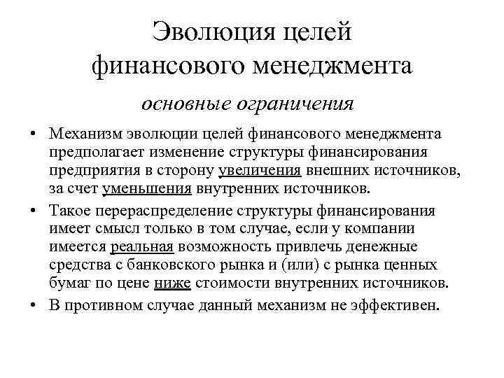 Эволюция целей финансового менеджмента основные ограничения • Механизм эволюции целей финансового менеджмента предполагает изменение структуры финансирования предприятия в сторону увеличения внешних источников, за счет уменьшения внутренних источников. • Такое перераспределение структуры финансирования имеет смысл только в том случае, если у компании имеется реальная возможность привлечь денежные средства с банковского рынка и (или) с рынка ценных бумаг по цене ниже стоимости внутренних источников. • В противном случае данный механизм не эффективен.
