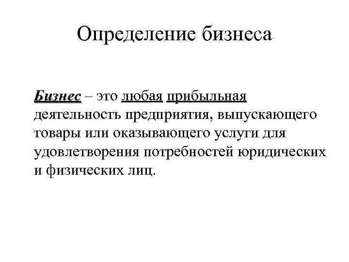 Определение бизнеса Бизнес – это любая прибыльная деятельность предприятия, выпускающего товары или оказывающего услуги для удовлетворения потребностей юридических и физических лиц.