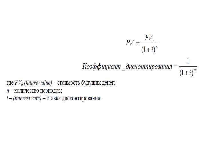 Основы финансовой математики • Дисконтирование (discounting) – приведение стоимости будущих затрат и доходов к нынешнему периоду времени, установление сегодняшнего эквивалента суммы, выплачиваемой в будущем