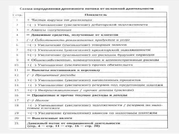 o Сумма притоков и оттоков денежных средств по основной, инвестиционной и финансовой деятельности дает итоговый резуль тат и равна чистому изменению денежных средств за период: Дельта CASH = CFFO + CFFI + CFFF, o o где Дельта CASH— изменение статьи «Денежные средства» за рассматриваемый период. CFFO - Денежные потоки от операционной (основной) деятельности CFFI - Денежные потоки от инвестиционной деятельности CFFF - Денежные потоки от финансовой деятельности