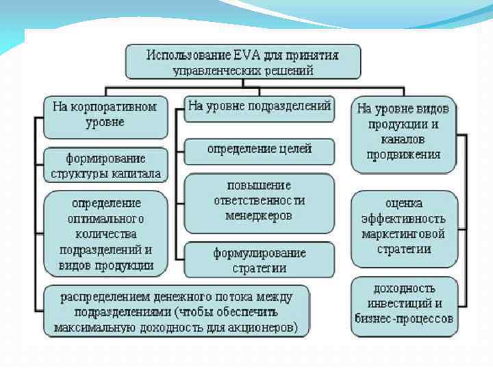 Показатель EVA может использоваться на различных уровнях принятия управленческих решений 1) На корпоративном 2)На уровне подразделений 3) На уровне видов продукции и каналов продвижения