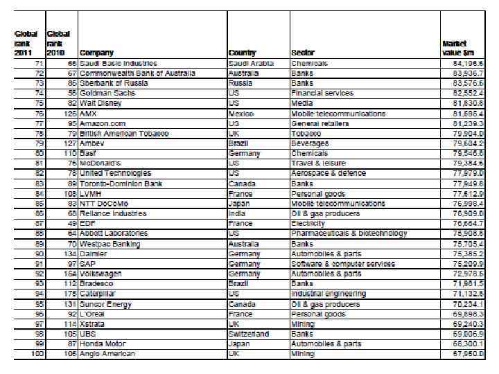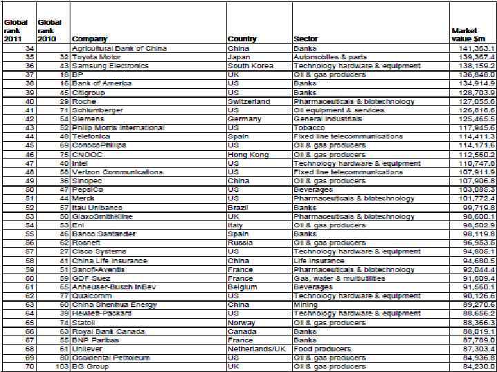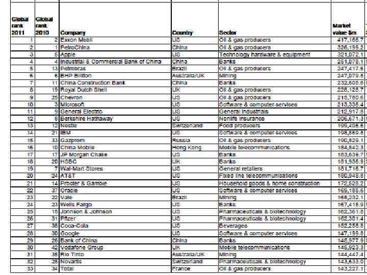 11 BNP Paribas 12 Petro. China Banking Oil & Gas Operations United States Telecommunicat ions Services United States Retailing 101, 06 157, 22 8, 37 16, 8 2952, 22 174, 95 86, 67 333, 84 123, 02 12, 54 268, 75 147, 55 408, 21 14, 34 170, 71 205, 37 United States Diversified Financials 16 Gazprom Russia Oil & Gas Operations 17 China Construction Bank China Banking 18 Petrobras-Petróleo Brasil Brazil Oil & Gas Operations 19 Total France Oil & Gas Operations 20 Chevron United States Oil & Gas Operations 21 Barclays United Banking Kingdom 22 Bank of China Banking 23 Allianz Germany Insurance 24 GDF Suez France Utilities 112, 49 8, 06 297, 12 190, 86 115, 25 24, 33 234, 77 132, 58 59, 16 104, 81 13, 59 16, 63 1106, 2 198, 26 184, 32 190, 34 160, 68 12, 1 183, 29 131, 8 159, 29 10, 48 164, 62 146, 23 65, 91 15, 17 2223, 04 56, 15 52, 2 130, 06 114, 65 9, 45 6, 16 6, 42 1016, 31 834, 04 245, 95 147 52, 74 83, 36 13 AT&T 14 Wal-Mart Stores 15 Berkshire Hathaway France China