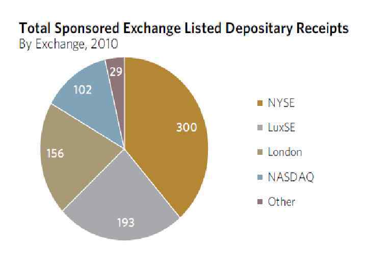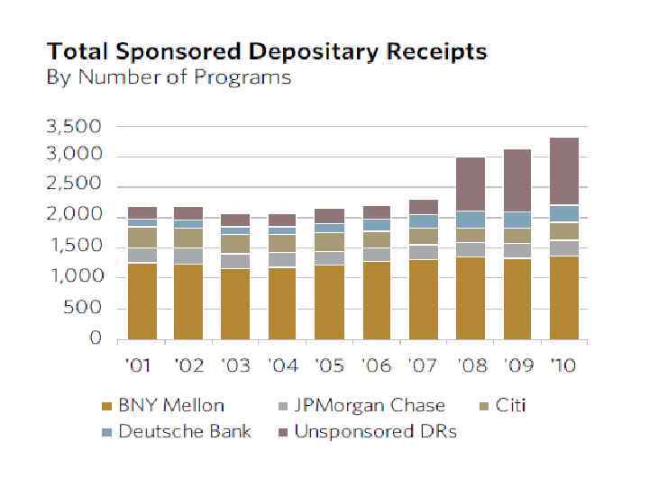Акции иностранных эмитентов на рынке США • Только в форме АДР • Кто выпускает: Bank of New York Mellon (64% на конец 2005 г. ), Morgan Guaranty (14%), Citibank (17%) и Deutsche Bank (5%). Большая часть программ российских эмитентов осуществлена через The Bank of New York. • Общее количество спонсируемых программ ДР на конец 2010 г. 2200