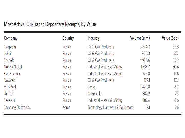 E u ro NA nex SD t (U A S Sh Q O ) To an M ky gh X o ai SE SE NY Lo She Gro SE nd nz up E on he ur S n on E SE ex Gr De t (E oup ut ur o Ho Ko sche pe ng rea B ) K E örs on xc e g E ha BM xc nge E h Sp TS ang an ish X G es E ro x u Au cha p Na Ta stra nge tio iw lia s na l S BM an S to E E NA ck &F Co SD E B r AQ SI xch OV p. O X S an ESP M w ge A X iss In No E d rd xch ia ic an Ex g ch e Is an M tan ge IC bu EX l М SE М ВБ NY SE 20 крупнейших бирж мира по обороту торговли акциями, 2010, трлн. долл. 17. 8 12. 7 20 -е место, 0, 6% мирового 4. 5 3. 8 3. 6 2. 7 2 1. 6 1. 5 1. 4 1. 1 0. 9 0. 8 0. 4 Источник: World Federation of Exchanges