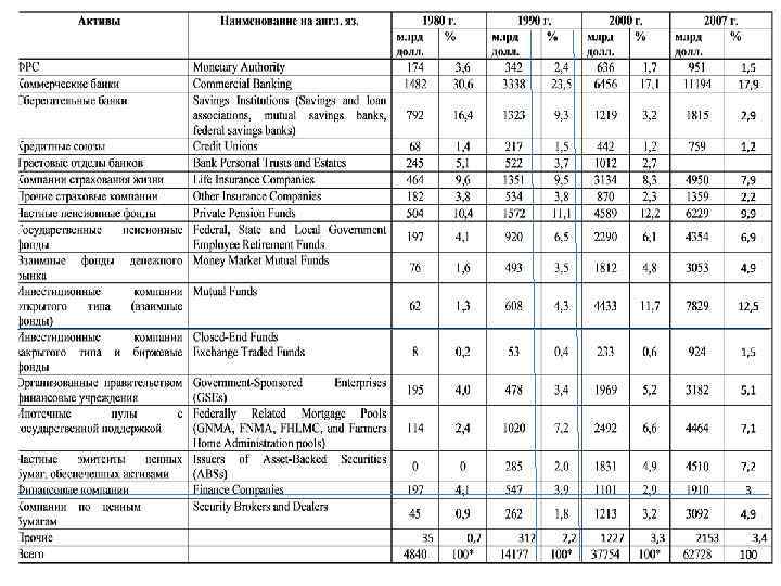 Доля отдельных институтов в финансовой системе США, 2010 г. Прочие 26% Компании по ценным бумагам 3% Инвестицион ные фонды 17% Банки 27% Пенсионные фонды 16% Страховые компании 10% Источник: US Federal Reserve. Flow of Funds Accounts