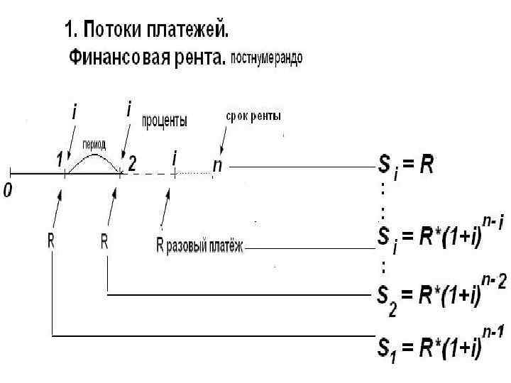 Регулярные потоки платежей • 1. Обыкновенные ренты. • Опр. Поток положительных платежей, разделенных равными временными интервалами, называется финансовой рентой, или просто рентой. • Опр. Промежуток между двумя последовательными платежами называется периодом ренты. • Опр. Если каждый платеж осуществляется в конце соответствующего ему периода, то рента называется обыкновенной (или рентой постнумерандо), а если в начале то рента называется авансовой (или пренумерандо). • Опр. Если все платежи равны между собой, то ренту называют постоянной. • В случае , когда период постоянной ренты равен одному году , ренту называют годовой , или аннутетом (иногда аннутетом называуют постоянную ренту с произвольным периодом).