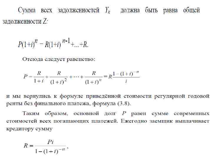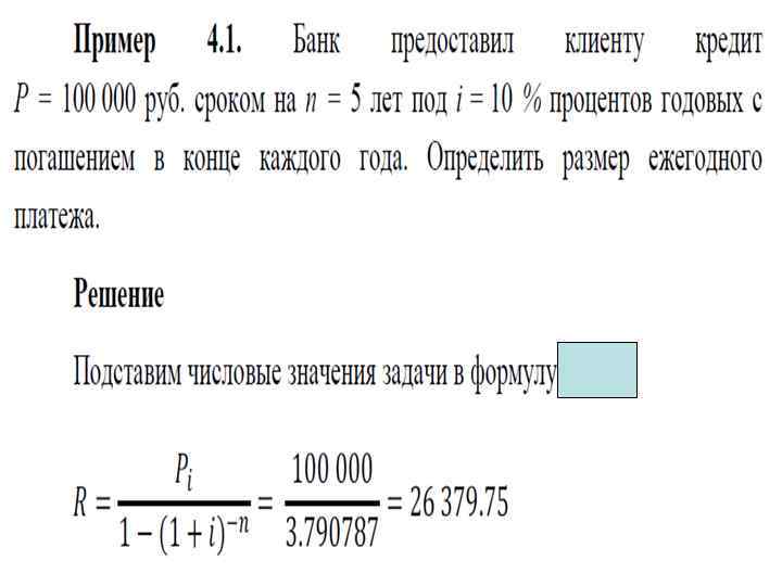 Пример 3. 7. Предприниматель взял кредит в размере 1 0 м л н руб. сроком на 3 года п о д 1 4 % г о д о в ы х. Р а с с ч и т а т ь р а з м е р е ж е г о д н ы х п о г а с и т е л ь н ы х платежей, если они будут выплачиваться a) в конце г о д а ; b )в н а ч а л е г о д а • Дано: n = 3 года, A = 10 000 руб. , i = 0, 14. Найти Ra и Rb = ? Решение. • а) Вычисляя по формуле (3. 8) находим: • Ra= • = 10 000*0, 14/[1 -1/(1+0, 14)3] = 4 307 314, 80 руб. • b) Вычисляя по формуле (3. 9) находим: • R = (10 000*0, 14)/[(1+0, 14)(1 -/(1+0, 14)3)] = 3 778 346, 32 руб.