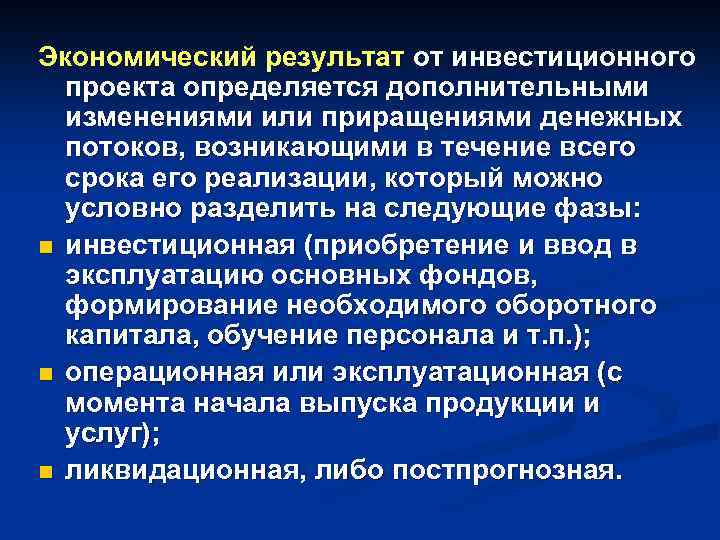 Экономический результат от инвестиционного проекта определяется дополнительными изменениями или приращениями денежных потоков, возникающими в течение всего срока его реализации, который можно условно разделить на следующие фазы: n инвестиционная (приобретение и ввод в эксплуатацию основных фондов, формирование необходимого оборотного капитала, обучение персонала и т. п. ); n операционная или эксплуатационная (с момента начала выпуска продукции и услуг); n ликвидационная, либо постпрогнозная.