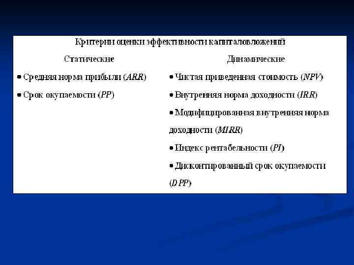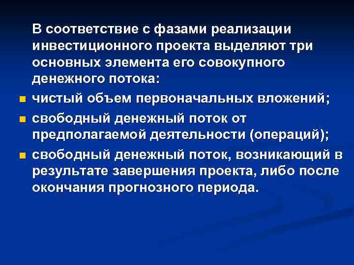 n n n В соответствие с фазами реализации инвестиционного проекта выделяют три основных элемента его совокупного денежного потока: чистый объем первоначальных вложений; свободный денежный поток от предполагаемой деятельности (операций); свободный денежный поток, возникающий в результате завершения проекта, либо после окончания прогнозного периода.