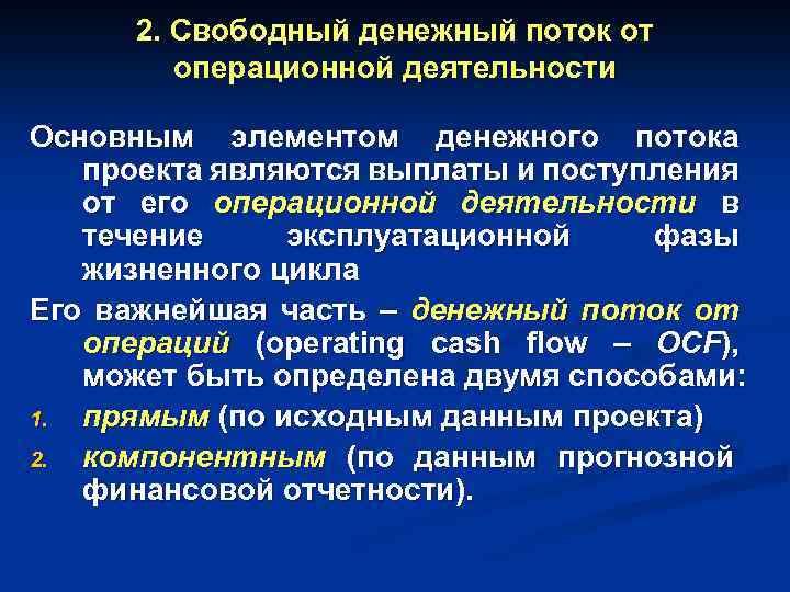 2. Свободный денежный поток от операционной деятельности Основным элементом денежного потока проекта являются выплаты и поступления от его операционной деятельности в течение эксплуатационной фазы жизненного цикла Его важнейшая часть – денежный поток от операций (operating cash flow – OCF), может быть определена двумя способами: 1. прямым (по исходным данным проекта) 2. компонентным (по данным прогнозной финансовой отчетности).