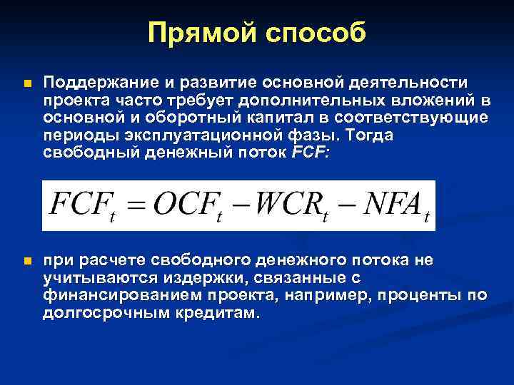 Прямой способ n Поддержание и развитие основной деятельности проекта часто требует дополнительных вложений в основной и оборотный капитал в соответствующие периоды эксплуатационной фазы. Тогда свободный денежный поток FCF: n при расчете свободного денежного потока не учитываются издержки, связанные с финансированием проекта, например, проценты по долгосрочным кредитам.