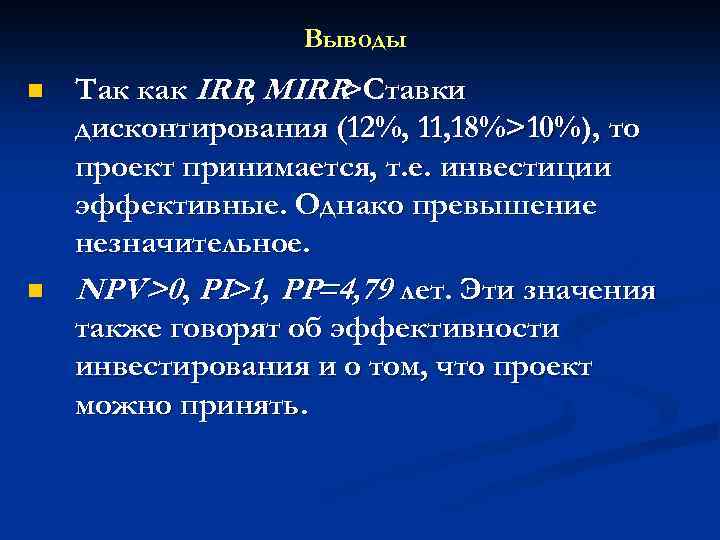 Выводы n n Так как IRR, MIRR >Ставки дисконтирования (12%, 11, 18%>10%), то проект принимается, т. е. инвестиции эффективные. Однако превышение незначительное. NPV >0 , PI>1, PP=4, 79 лет. Эти значения также говорят об эффективности инвестирования и о том, что проект можно принять.