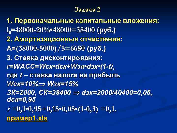 Задача 2 1. Первоначальные капитальные вложения: I 0=48000 -20% • 48000=38400 (руб. ) 2. Амортизационные отчисления: А=(38000 -5000)/5=6680 (руб. ) 3. Ставка дисконтирования: r=WACC=Wск • dск+Wзк • dзк • (1 -t), где t – ставка налога на прибыль Wск=10% Wзк=15% ЗК=2000, СК=38400 dзк=2000/40400=0, 05, dск=0, 95 r =0, 1 • 0, 95+0, 15 • 0, 05 • (1 -0, 3) =0, 1. пример1. xls