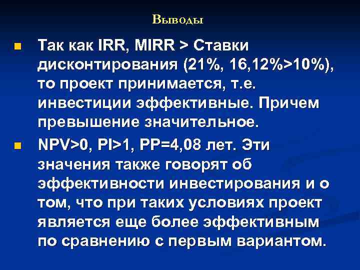 Выводы n n Так как IRR, MIRR > Ставки дисконтирования (21%, 16, 12%>10%), то проект принимается, т. е. инвестиции эффективные. Причем превышение значительное. NPV>0, PI>1, PP=4, 08 лет. Эти значения также говорят об эффективности инвестирования и о том, что при таких условиях проект является еще более эффективным по сравнению с первым вариантом.