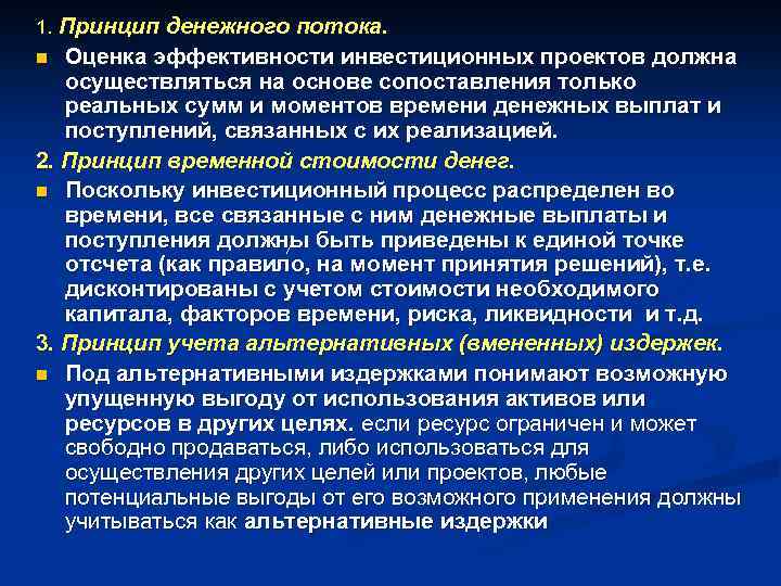 1. Принцип денежного потока. Оценка эффективности инвестиционных проектов должна осуществляться на основе сопоставления только реальных сумм и моментов времени денежных выплат и поступлений, связанных с их реализацией. 2. Принцип временной стоимости денег. n Поскольку инвестиционный процесс распределен во времени, все связанные с ним денежные выплаты и поступления должны быть приведены к единой точке отсчета (как правило, на момент принятия решений), т. е. дисконтированы с учетом стоимости необходимого капитала, факторов времени, риска, ликвидности и т. д. 3. Принцип учета альтернативных (вмененных) издержек. n Под альтернативными издержками понимают возможную упущенную выгоду от использования активов или ресурсов в других целях. если ресурс ограничен и может свободно продаваться, либо использоваться для осуществления других целей или проектов, любые потенциальные выгоды от его возможного применения должны учитываться как альтернативные издержки n