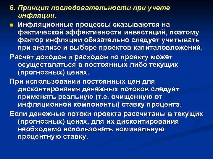 6. Принцип последовательности при учете инфляции. n Инфляционные процессы сказываются на фактической эффективности инвестиций, поэтому фактор инфляции обязательно следует учитывать при анализе и выборе проектов капиталовложений. Расчет доходов и расходов по проекту может осуществляться в постоянных либо текущих (прогнозных) ценах. При использовании постоянных цен для дисконтирования денежных потоков следует применять реальную (т. е. очищенную от инфляционной компоненты) ставку процента. Если денежные потоки проекта рассчитаны в текущих (прогнозных) ценах, для их дисконтирования необходимо использовать номинальную процентную ставку.