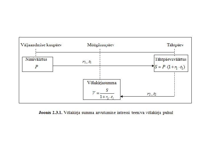 • I. Etapp. Nimiväärtus P teenib intressimääraga r 1 (mis on fikseeritud ka võlakirjal) ajaperioodi t 1 jooksul. Valemiga arvutatakse siis tähtpäevaväärtus. • II. Etapp. Müügikuupäeval peab võlakirja valdaja leppima selle hinnaga, mis arvutatakse tähtpäevaväärtusest turul sel hetkel valitseva intressimäära r 2 järgi, st võlakirjasummaks on tähtpäevaväärtuse S nüüdisväärtus V müügikuupäeval (st t 2 aastat enne tähtpäeva), mis sõltub turul valitsevast intressimäärast r 2. Kuna võimalikul ostjal on rahaturul võimalik valida erinevate võimaluste vahel, siis ta lihtsalt ei ole nõus väärtusest r 2 väiksema intressimääraga; võlakirja müüja aga pole nõus väärtusest r 2 suurema intressimääraga, kuna vastavalt turul valitsevale olukorrale on tal võimalik leida ostja, kes nõustub intressimääraga r 2.