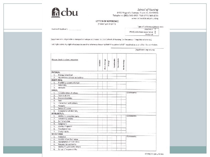 Physical Therapy Letter of Recommendation Characteristics • • • Responsibility: The ability to fulfill commitments, be accountable for actions and outcomes, and to persevere to achieve goals Critical Thinking: The ability to question logically; identify, generate and evaluate elements of logical argument; recognize and differentiate facts, illusions, assumptions; distinguish the relevant from the irrelevant Stress Management: The ability to identify sources of stress, develop effective coping behaviors, and adapt well to change Problem Solving: The ability to recognize and define problems, use imagination and creativity to solve problems, analyze data, develop and implement solutions, and evaluate outcomes Leadership: The ability to take initiative and motivate or guide others; generates ideas and plans or shares a vision for the future