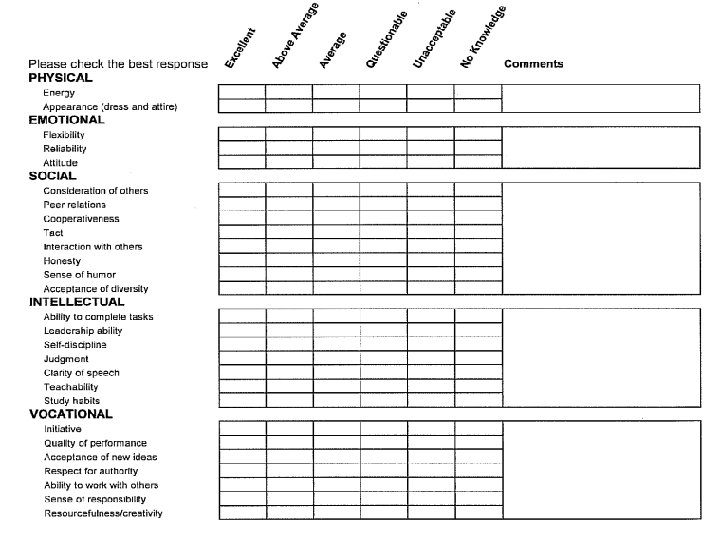 FOR PTCAS: How would you rate the applicant for each of the following characteristics? • Commitment to Learning: The ability to self-assess, self-correct and self direct; identify needs and sources of learning; continually seek new knowledge and understanding. • Interpersonal Skills: The ability to interact effectively with patients, families, colleagues, other healthcare professionals and the community; deal effectively with cultural or ethnic diversity issues. • Communication Skills: The ability to communicate effectively (speaking, body language, reading writing, listening) for varied audiences and purposes. • Effective Use of Time: The ability to obtain the maximum benefit from a minimum investment of time and resources. • Use of Constructive Feedback: The ability to identify sources of and seek out feedback; to effectively use and provide feedback for improving personal interaction.