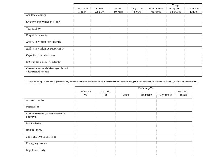 FOR PTCAS: How would you rate the applicant for each of the following characteristics? • Commitment to Learning: The ability to self-assess, self-correct and self direct; identify needs and sources of learning; continually seek new knowledge and understanding. • Interpersonal Skills: The ability to interact effectively with patients, families, colleagues, other healthcare professionals and the community; deal effectively with cultural or ethnic diversity issues. • Communication Skills: The ability to communicate effectively (speaking, body language, reading writing, listening) for varied audiences and purposes. • Effective Use of Time: The ability to obtain the maximum benefit from a minimum investment of time and resources. • Use of Constructive Feedback: The ability to identify sources of and seek out feedback; to effectively use and provide feedback for improving personal interaction.